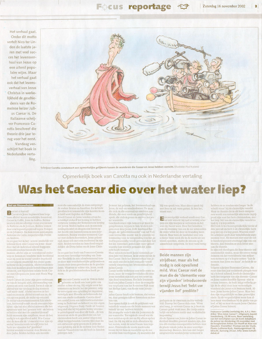 Het verhaal gaat. Onder dit motto vertelt Nico ter Linden de laatste jaren met veel succes het levensverhaal van Jezus op een uiterst populaire wijze. Maar het verhaal gaat ook dat het levensverhaal van Jezus Christus in werkelijkheid de geschiedenis van de Romeinse keizer Julius Caesar is. De Italiaanse schrijver Francesco Carotta beschreef die theorie drie jaar terug voor het eerst. Vandaag verschijnt het boek in Nederlandse vertaling.